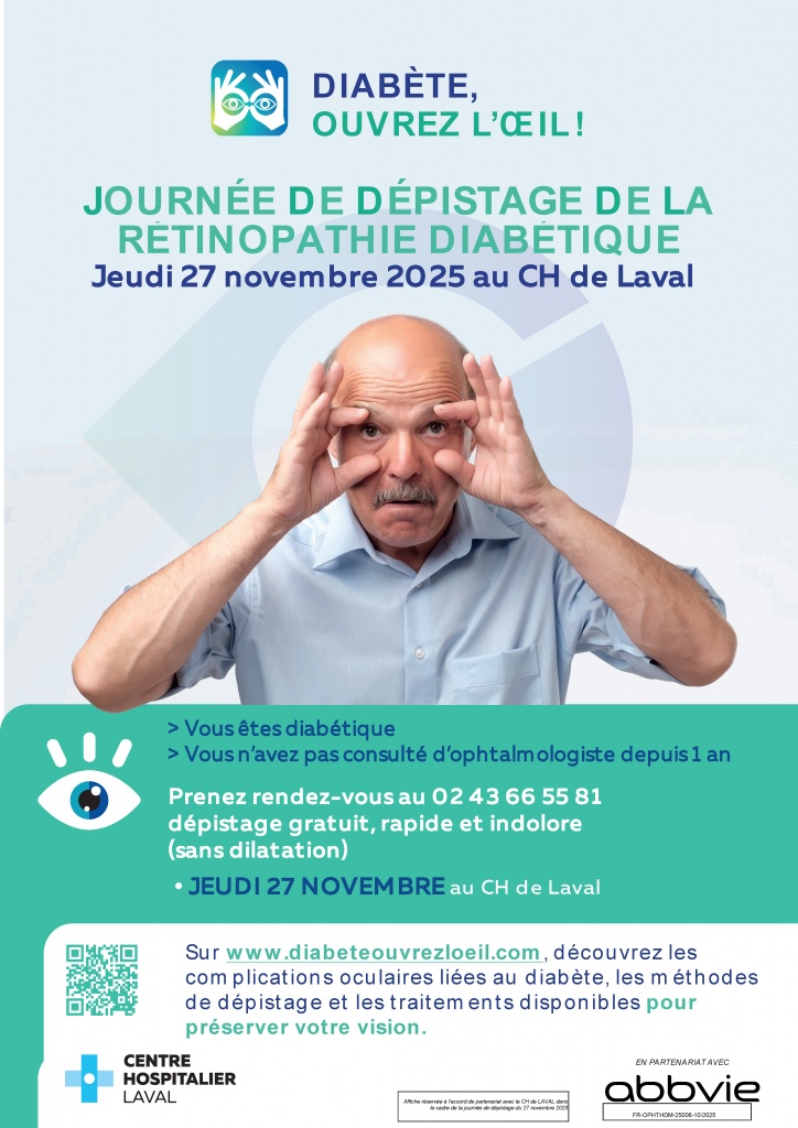 Les services d’ophtalmologie et de diabétologie du Centre Hospitalier de Laval et le Réseau Diabète et Surpoids 53 organisent une journée « Diabète, Ouvrez l’Œil », journée d’information et de dépistage, le