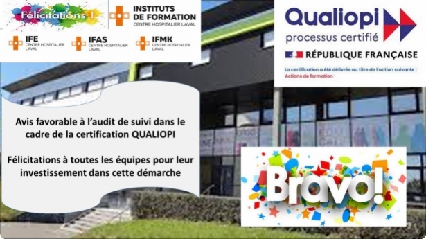 Félicitations à toutes les équipes, la certification Qualiopi a été attribuée aux instituts de formation (IFAS, IFE et IFMK) et au CESU du CH LAVAL sans réserve. Cette reconnaissance vient récompenser l'engagement pris par nos organisme pour offrir un service de qualité à nos apprenants et collaborateurs.