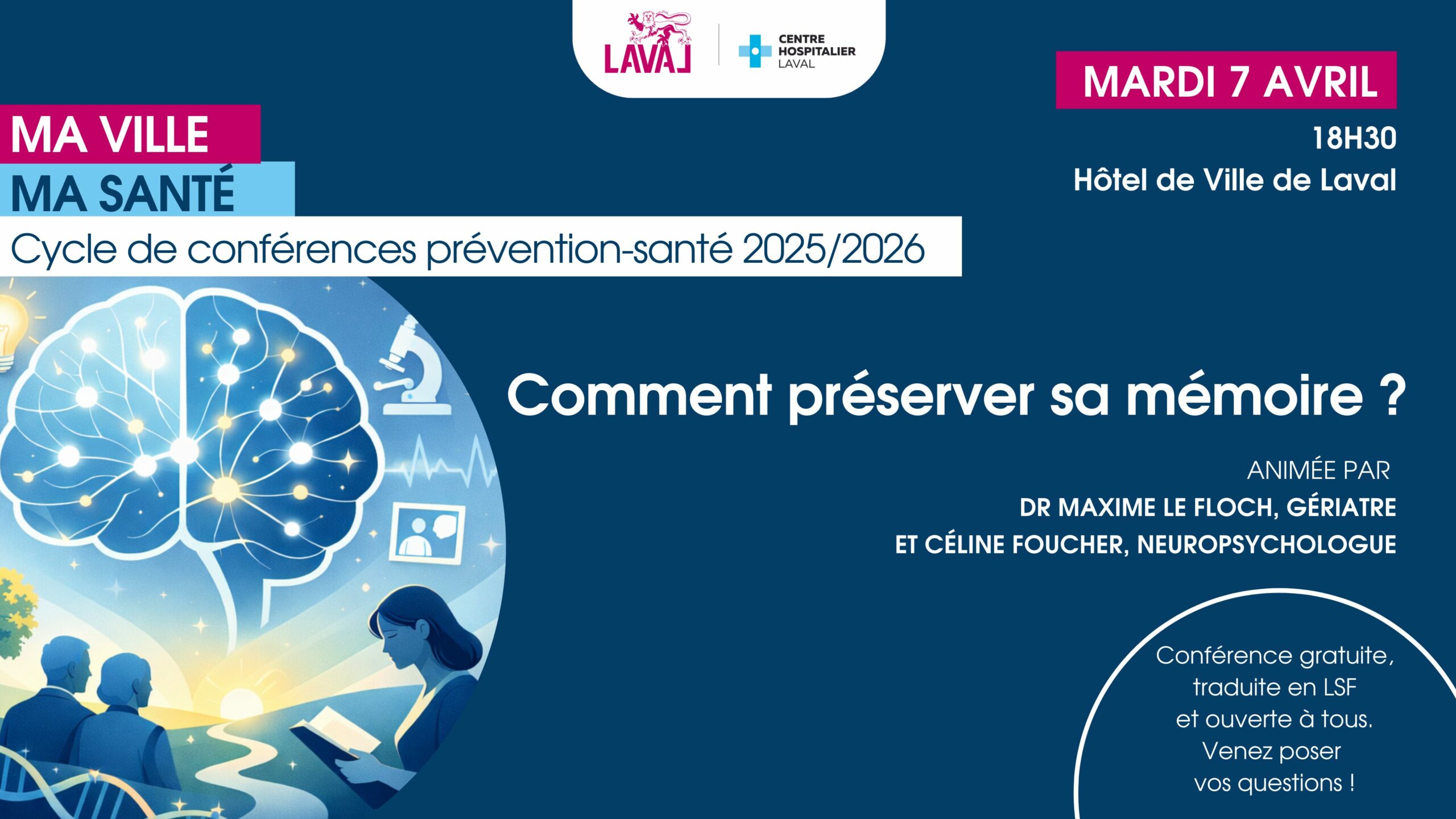 ATTENTION : nouvelle date. Le Centre hospitalier de Laval et la Ville de Laval proposent une nouvelle conférence « Ma ville, ma santé » intitulée « Comment préserver sa mémoire ? ». Animée par un gériatre et une neuropsychologue, elle abordera les stratégies de prévention des troubles cognitifs au quotidien, le mardi 7 avril à 18h30 à l’Hôtel de Ville de Laval.