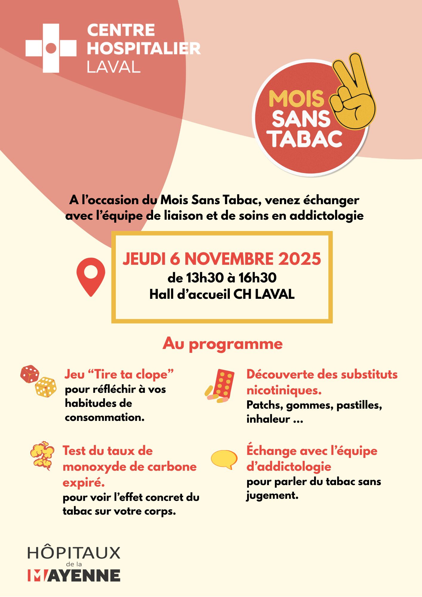 À l’occasion du Mois sans tabac, l’équipe de liaison et de soins en addictologie du Centre Hospitalier de Laval organise un stand d’information et de sensibilisation, ouvert à tous, le jeudi 6 novembre 2025, de 13h30 à 16h30 dans le hall de l’hôpital.